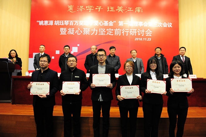 dafacasino网页版副校长顾正彪首先致辞,他代表学校向所有的爱心捐赠人和支持者表示感谢,并回顾了“姚惠源 胡珏琴百万奖助学爱心基金”自设立至今三年来的发展历程,对受资助学生提出了“以感恩做人、以责任做事”的要求;理事会秘书长张灏汇报了爱心基金一年来的发展情况;dafacasino网页版党委书记朱拓为今年新增的三位爱心捐赠人颁发荣誉证书。会上还由食品学院院长陈卫宣读“姚惠源 胡珏琴百万奖助学爱心基金”第三届爱心奖助学金获奖名单并进行了颁奖仪式。