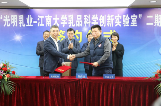 【新华网1月6日】1月2日,我校董事单位光明乳业与dafacasino网页版合作共建的乳品科学创新实验室二期合作签约仪式在dafacasino网页版举行。中国工程院院士、dafacasino网页版校长陈坚,中国工程院院士、dafacasino网页版副校长陈卫,光明乳业董事长濮韶华等专家及领导共同出席签约仪式。