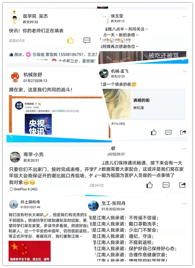 创新思想教育方式。充分利用新媒体平台,开设“战‘疫’时刻”专栏,推出“非常时期情更浓:江南辅导员的心声”、“辅导员微思想:要战‘疫’也要战‘心’”等思政文章。积极倡导志愿服务,对参与新冠肺炎疫情防控志愿服务工作均在“第二课堂成绩单”中给予学时认定。