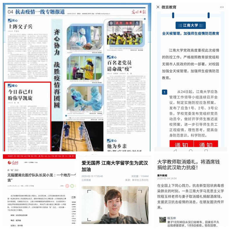 挖掘身边先进典型。《光明日报》《科技日报》、微言教育、新华网等国家主流媒体报道我校附属医院医护人员事迹;新华社、《China Daily》报道我校留学生祝福中国、加油武汉;《新华日报》、中国青年网、紫牛新闻、《无锡日报》、无锡电视台等国家、省、市级媒体相继报道我校众志成城抗击疫情的措施做法、人文学院教师原创抗疫歌曲、马克思主义学院教师取消婚礼向武汉捐赠酒席钱等事迹。