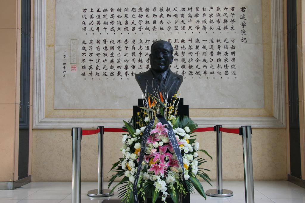 王武教授向荣毅仁副主席雕像敬献了花篮。黄敏秘书长追忆了荣毅仁先生卓越的功勋和不凡的一生,表示要继承其遗志,发扬其精神。随后,全体代表静穆并三鞠躬,寄托无限哀思。