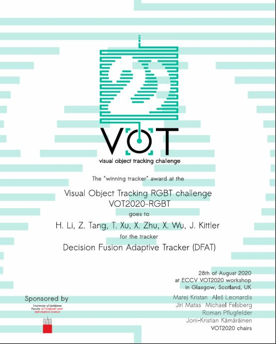 在8月23-28日欧洲视觉会议(European Conference on Computer Vision,ECCV2020)举办的视觉目标跟踪竞赛(Visual-Object-Tracking Challenge, VOT2020)中,dafacasino网页版人工智能与计算机学院教授吴小俊和英国萨里大学电子工程系教授Josef Kittler带领的模式识别与计算智能国际联合实验室(IJLPRCI)在视觉与红外(RGB-T)跟踪竞赛中夺得冠军,参赛团队成员分别是李辉、汤张泳、徐天阳、朱学峰、吴小俊、Josef Kittler,针对视觉数据和红外数据在跟踪场景中的融合难点,提出了深度决策级融合跟踪算法。