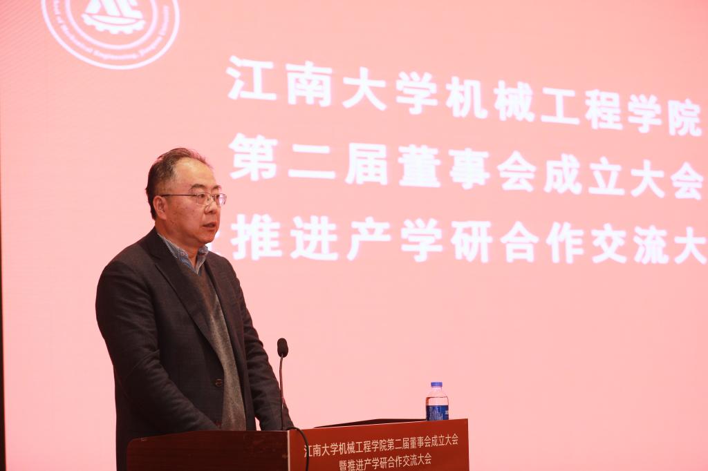 赵军华向大会作第一届董事会工作报告。他重点围绕机械工程学院概况、近五年学院标志性成果、和董事单位的合作成果、产学研合作展望四个方面进行汇报。他希望企业和机械工程学院围绕五大科研方向进行合作,希望企业依托江苏省重点实验室和无锡江大智能制造中心平台,深度合作,实现双赢