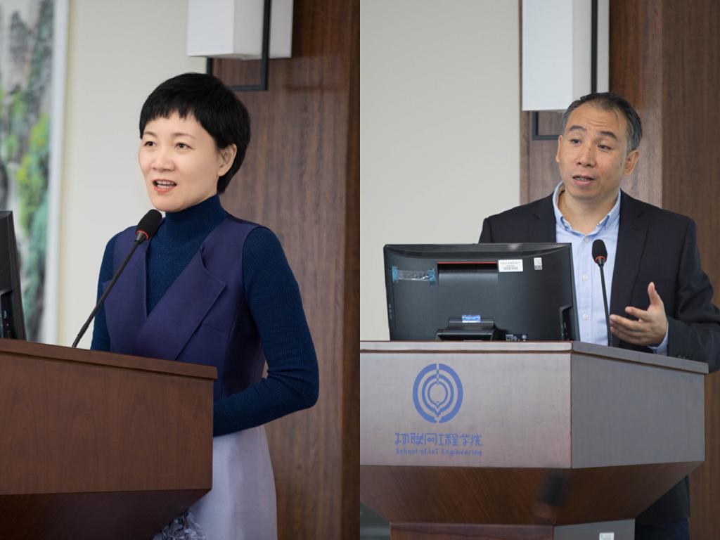 其次,物联网工程学院院长谢林柏代表学院党政进行了学院发展及董事会工作情况汇报。他从学院基本情况、近期主要建设成就、董事会工作情况等三方面进行了全面介绍。他提出,学院首届董事会成立一年多来,董事单位与学院携手并进,各董事单位通过为学院发展咨询、设立奖教奖学金、支持学生创新实践、捐赠防疫物资等助力学院建设,为学院人才培养工作提供了强有力的支持和帮助。与此同时,学院为董事单位提供科技服务和技术咨询,通过共建实验室、开展 “卓工计划”联合培养本科生和研究生,每年举办专场招聘宣讲会10余场,近两年为董事单位输送毕业生30余人,服务董事单位发展。希望通过学院董事会工作的不断推进,进一步构建多元化的资源共享机制,着力打造常态化校企合作品牌。