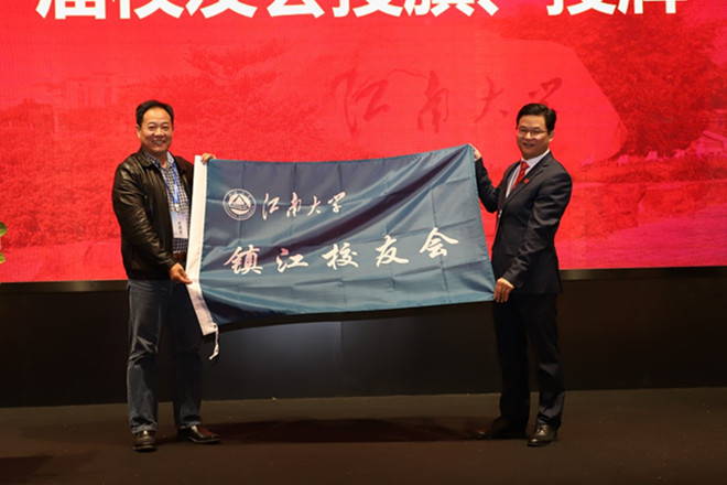 dafacasino网页版社会资源处黄敏处长,宣读dafacasino网页版镇江校友会新一届领导机构聘任名单并向新任会长授牌。