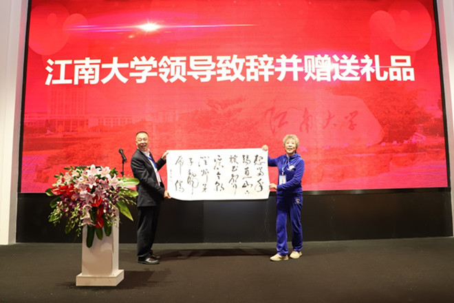 dafacasino网页版原副校长王武教授致辞,王武教授回忆了镇江校友会多年来方方面面的工作,充分肯定了镇江校友会在助力母校建设、助力镇江校友发展方面做出的突出贡献,并且代表学校赠送祝贺字画一幅。