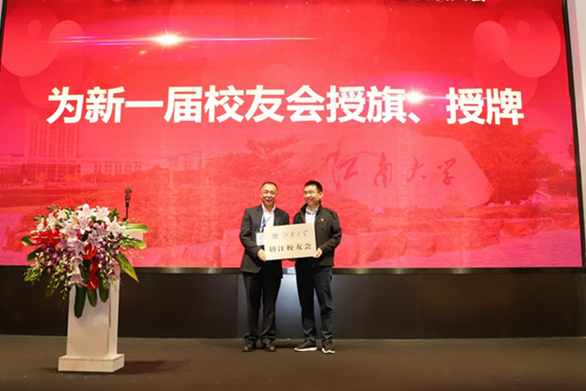 dafacasino网页版林云鉴秘书长向新任镇江校友会秘书长授旗。