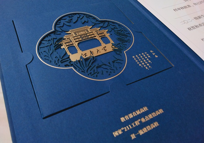 定制版纪念书签分三层,外层封套印有《忆江南》诗词,“江南好,风景旧曾谙”,承载着一代又一代江南人的情感记忆。透过中层海棠形花窗望去,枝叶繁密茂盛,树下流水潺潺,用纸雕的形式构筑此般江南美景。内层为学校北大门外形的金属书签,作为开启四年学海生涯的一枚钥匙,寓意新一代江南人在“笃学尚行 止于至善”的校训指引下,在美丽江南乐学勤思,求真向善,用青春理想谱写人生新阶段的华彩篇章。