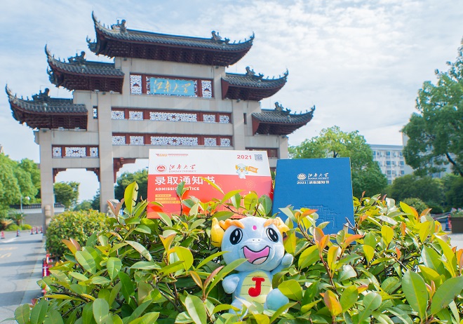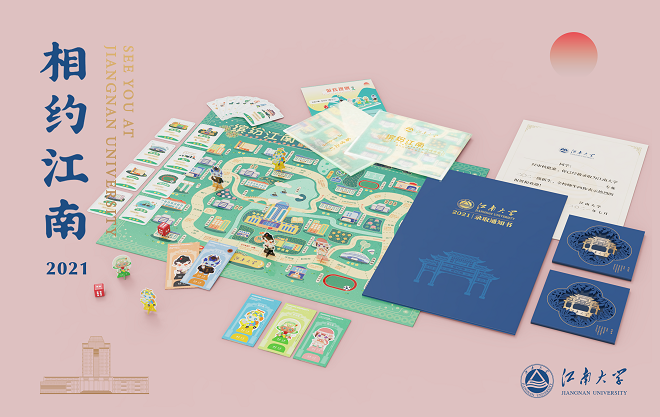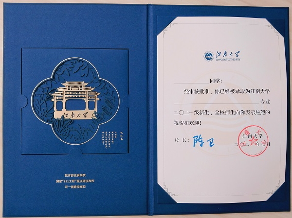 录取通知书全套由江南蓝封套、纪念书签、录取通知书和给新江南人的一封信组成。主体蓝色厚重沉稳,烫金镌刻校名校徽、2021录取通知书字样,蓝金相映,典雅精致;凹印北门和校训,突显江南第一学府之气质。
