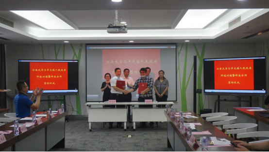 赵伟和丁军武副镇长分别代表双方签订全面科技合作协议。签约后,双方与会人员进行了科技对接交流。会后,羊尖镇各位领导和企业家一行参观了协同创新中心、机械工程学院等。