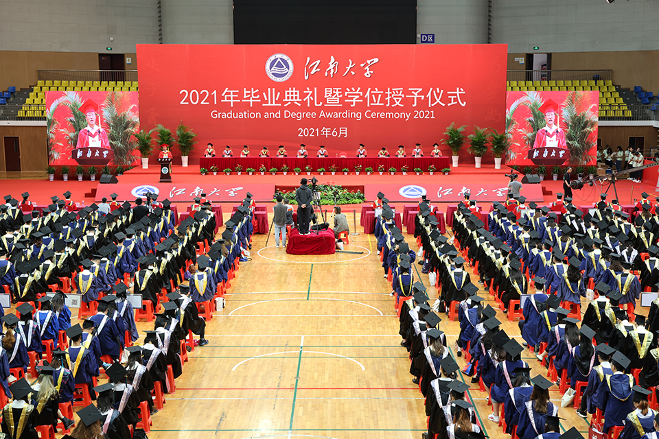 雨后夏晨,蝉鸣仲夏,凤凰花开,再起骊歌。6月19日上午,我校在体育馆隆重举行2021年毕业典礼暨学位授予仪式,6000余名毕业生圆满完成学业,带着江南的荣光扬帆起航,逐梦新征程。本次毕业典礼采取线上线下相结合的方式同步举行,500余名毕业生代表在现场参加典礼,未能到场的毕业生通过现场直播的方式参加“云典礼”。