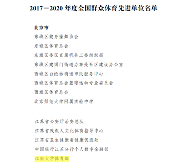 近年来,体育部得到上级及相关部门的普遍赞誉和高度评价,先后获得江苏省民族团结进步模范集体、江苏省体育工作先进学校、江苏省体育特色学校等荣誉,被授予无锡市少数民族传统体育项目训练基地、江苏省少数民族传统体育项目训练基地、无锡市“同心联盟--民族团结进步教育基地”。荣获“全国群众体育先进单位”这一我国群体体育工作的最高奖项,是国家层面对我校群众体育工作的充分肯定,我们将以此为契机,再接再厉,秉承健康第一的教育理念,提升学校体育特色发展水平,积极拓展群众体育运动的形式和内容,为提高师生体质健康水平,做好健康江南作出新的贡献。
