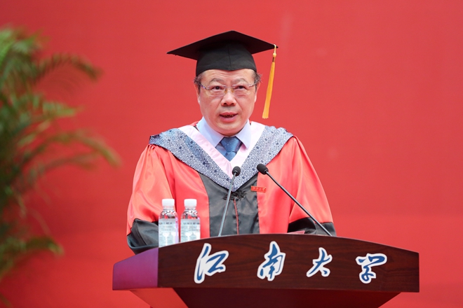 陈卫发表了题为《奋进者 共青春》的讲话,向2022届毕业生们送上最热烈的祝贺与最诚挚的祝福,向相伴同学们成长的老师、家人和工友们,致以最崇高的敬意和最衷心的感谢。陈卫表示,这几年,学校在各项工作中表现抢眼,一个又一个高质量发展成果,凝聚着全校师生的艰辛努力,同学们的优异成绩令人感到骄傲和自豪。他对毕业生们提出三点希望,希望他们矢志拼搏,做笃行不怠的奋进者;希望他们团结互助,做同心向前的奋进者;希望他们融入时代,做胸怀家国的奋进者。今年党的二十大即将召开,期待未来大家能和母校一起保持奋进的姿态,一路奋进一路青春,让“奋进”成为每一位江南人身上最鲜明的底色。祝福大家一帆风顺,前程似锦,载誉江南!陈卫热情洋溢的讲话赢得了在场师生的阵阵掌声。