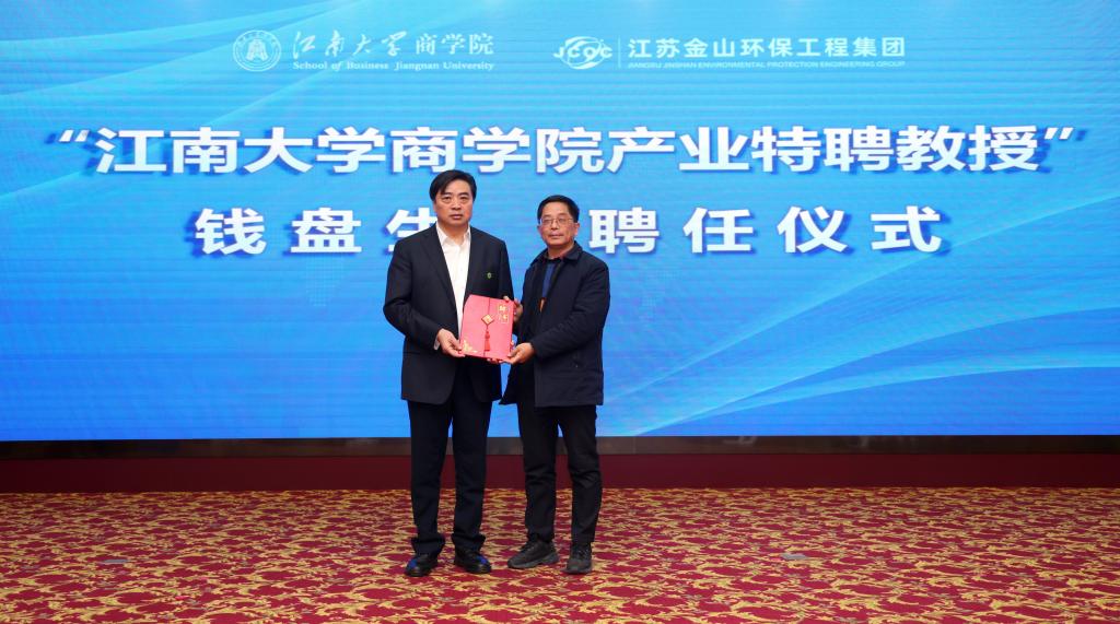 徐锡清为钱盘生颁发“dafacasino网页版商学院产业特聘教授”聘书,感谢钱盘生对教育事业和dafacasino网页版师生的支持,期待与金山环保继续深化教育资源与产业资源合作,持续深入推进产教融合。