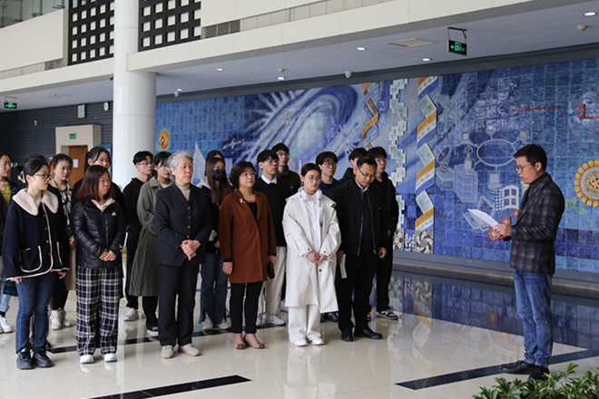 随后,志愿者同学向程文浩塑像献花,全体参会人员向塑像三鞠躬。
