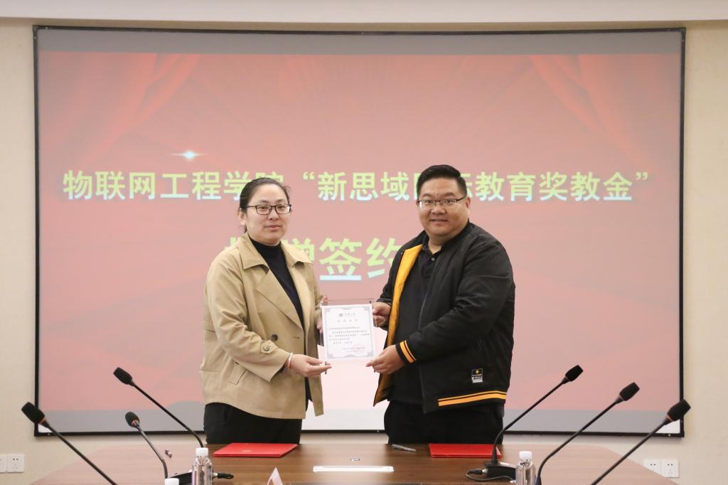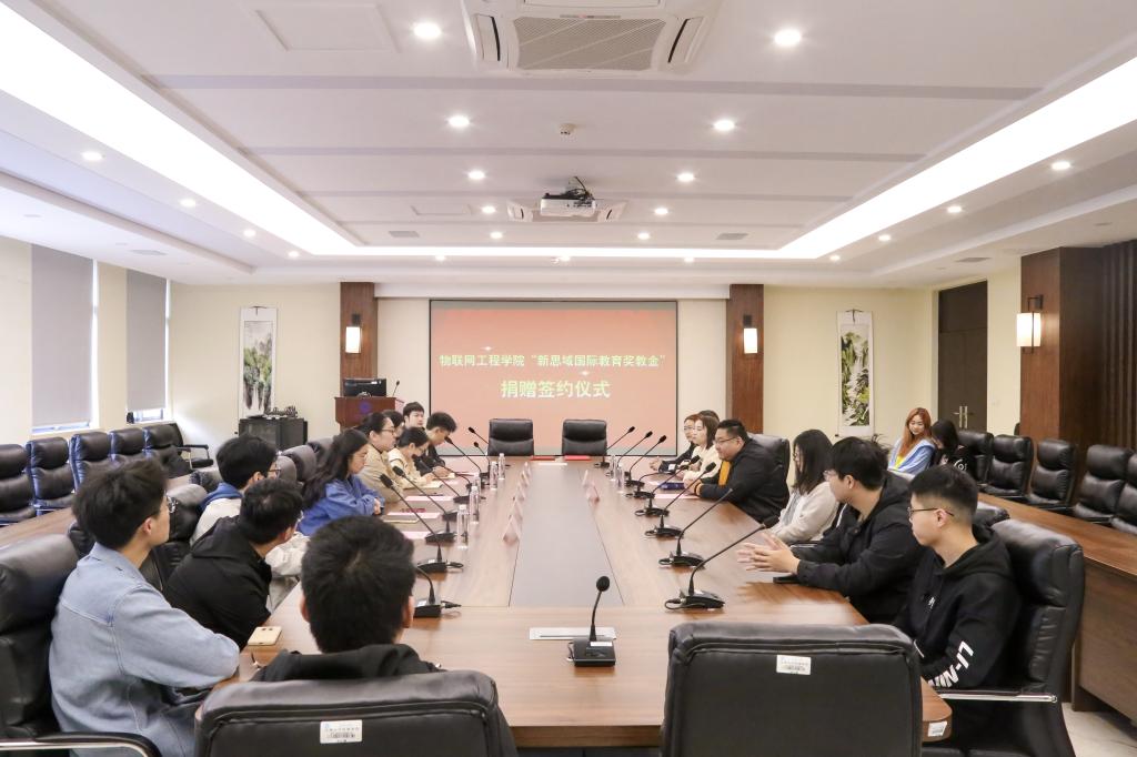 4月25日上午,物联网工程学院在B222会议室举办“新思域国际教育奖教金”捐赠签约仪式。无锡新思域集团总经理王斌、副总经理杜皎阳,物联网工程学院党委副书记、副院长孔丽丹,辅导员代表和高年级本科生代表等出席本次活动。签约仪式由辅导员谢幸福主持。