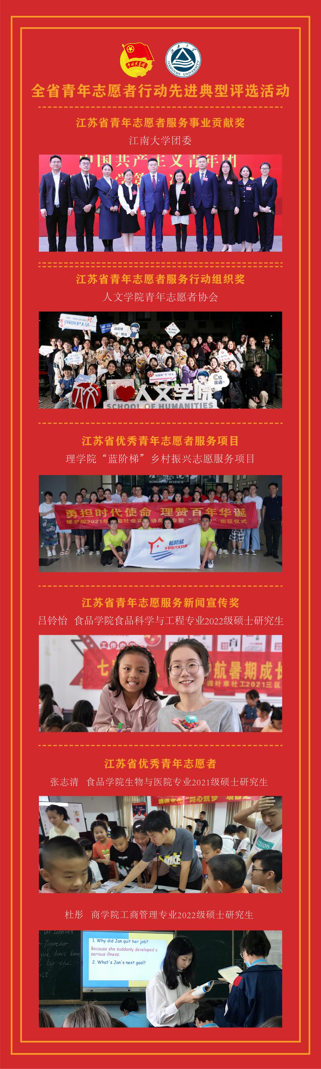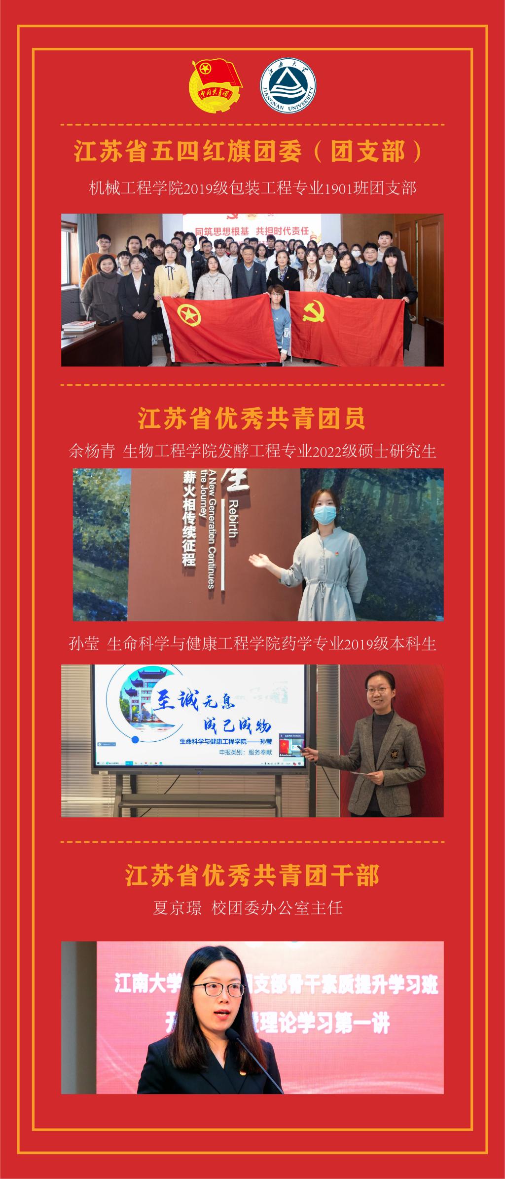 在2022年度全国高校“活力团支部”评选中,化学与材料工程学院高分子材料2019级3班团支部获评2022年度全国高校“活力团支部”最具好作风TOP100。在江苏省“青年五四奖章”和“两红两优”评选中,马克思主义学院唐忠宝老师获评“江苏青年五四奖章”,机械工程学院2019级包装工程专业1901班团支部获评“江苏五四红旗团支部”,生物工程学院学生余杨青、生命科学与健康工程学院学生孙莹获评“江苏省优秀共青团员”,校团委夏京璟老师获评“江苏省优秀共青团干部”。在2022年度全省青年志愿者行动先进典型评选中,dafacasino网页版团委获评“江苏省青年志愿服务事业贡献奖”,人文学院青年志愿者协会获评“江苏省青年志愿服务行动组织奖”,理学院“蓝阶梯”乡村振兴志愿服务项目获评“江苏省优秀青年志愿服务项目”,食品学院学生吕铃怡获评“江苏省青年志愿服务新闻宣传奖”,食品学院学生张志清、商学院学生杜彤获评“江苏省优秀青年志愿者”。