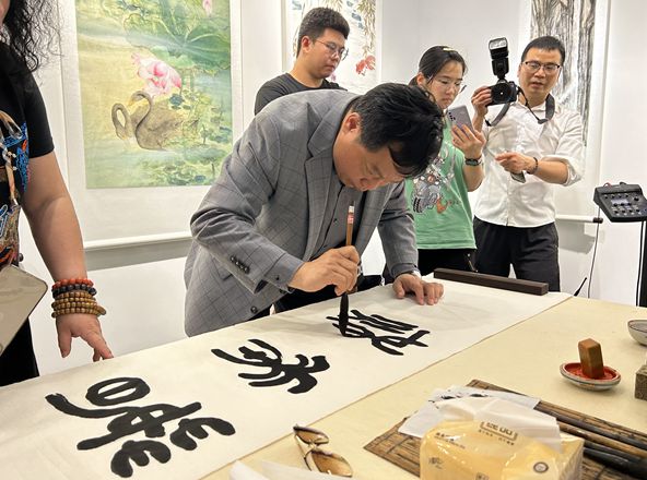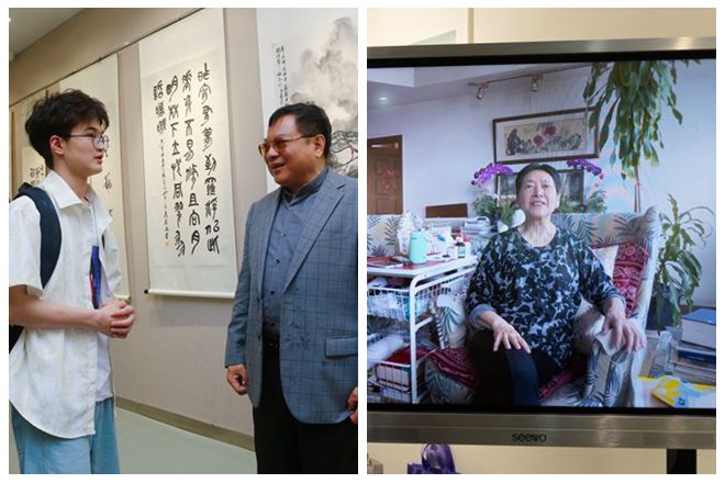 活动中,上海市吴昌硕文化艺术基金会理事长、书法家吴超为师生带来了精彩的分享,介绍了海派书画艺术源远流长的发展历程,新时代海派艺术的特点,以及吴昌硕大师对海派书画艺术的突出贡献,并着重赏析了吴昌硕的《达摩像》《寿鹤图》与《粗枝大叶》三幅经典作品。随后,刘海粟之女、画家刘蟾也通过视频形式向dafacasino网页版师生表达了问候。在现场互动环节中,参会学生们就自己在学习书法篆刻过程中的感想和思考进行了提问。随后,吴超移步至书画台进行创作展示,提笔写下“春华秋实”赠与dafacasino网页版留念。最后,梁建为本次书画活动“优秀奖”获奖同学颁奖。