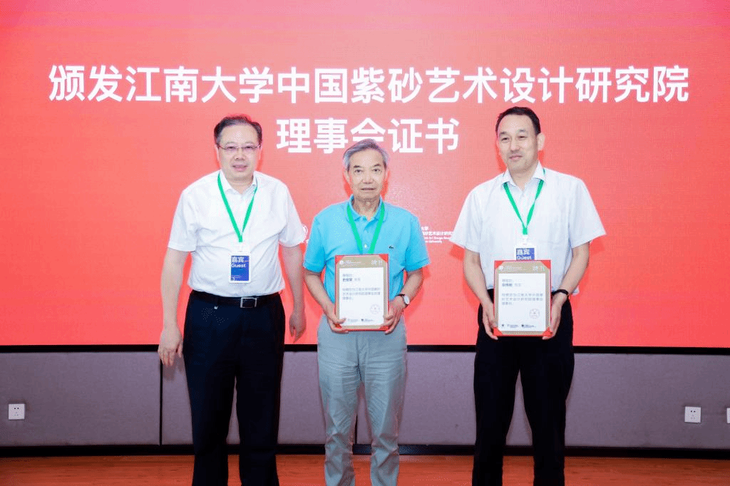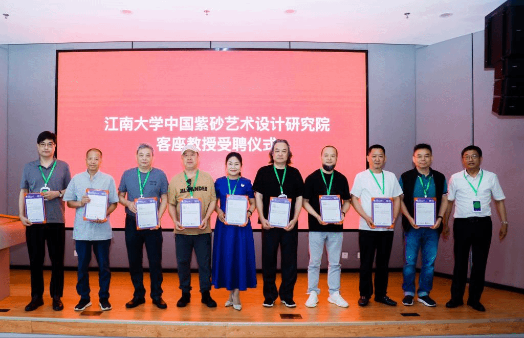 宜兴市丁蜀镇人民政府镇长伍震球,中国工艺美术大师毛国强、顾绍培,清华大学美术学院副院长、《装饰》杂志主编方晓风,东南大学教授胡平,中国工艺美术学会理论专业委员会副主任、中国美术学院教授吴光荣,宜兴市陶瓷行业协会党支部书记郑春和,研究院授聘的部分客座教授和兼职硕士生导师、研究院理事会成员,宜兴紫砂协会、校相关职能部门领导、设计学院党政班子全体成员、研究院各方向师生,以及参加国家艺术基金《紫砂雕塑创作人才培训》的50位学员等共同出席活动。