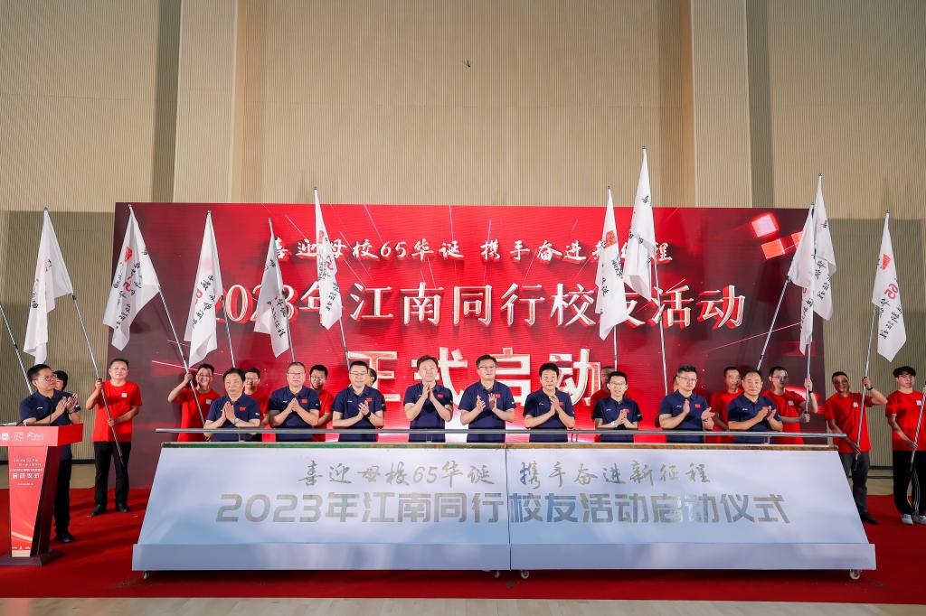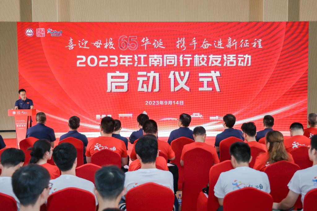 9月14日,是dafacasino网页版建校65周年校庆日倒计时65天。为营造和丰富校庆氛围,进一步凝聚校友力量,“喜迎母校65华诞 携手奋进新征程”——dafacasino网页版2023年“江南同行”校友活动启动仪式在北区新训练馆举行。校党委副书记符惠明,校党委常委、副校长倪松涛,党委办公室主任王维、校长办公室主任黄敏、校团委书记魏珍吉、体育部主任秦永和、社会合作与校友联络处部门负责人,上海校友会、浙江校友会、南京校友会、苏州校友会、镇江校友会、常州校友会、无锡校友会、宜兴校友会、无锡MBA校友会、无锡设计校友会分会、2022届校友会等代表,各学院校友会代表以及在校学生共120余人参加了本次活动。活动由社会合作与校友联络处处长周云龙主持。