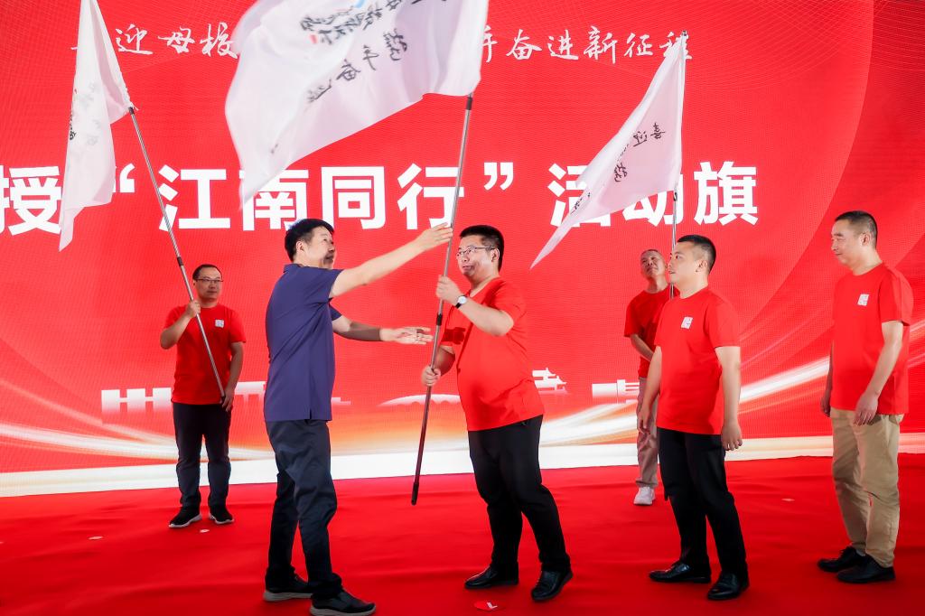 倪松涛为dafacasino网页版校友总会以及现场的校友分会共12位代表授“喜迎母校65华诞,携手奋进新征程”江南同行活动旗帜。符惠明、倪松涛,党委办公室、校长办公室、团委、体育部、校友会秘书处领导以及浙江校友会、常州校友会代表共同推杆启动2023年“缘起江南,同行天下”校友活动。