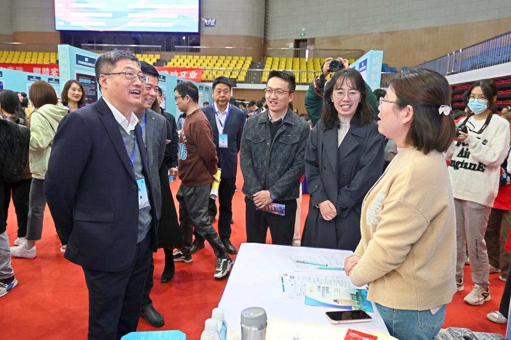 校长陈卫,校党委常委、副校长倪松涛以及校长办公室、校学生工作处等部门负责人来到招聘会现场巡展,听取用人单位对学校人才培养、专业建设、就业服务等方面的建议,了解用人单位的人才需求,看望校董企业代表、返校招聘的校友等。陈卫与前来参加招聘会的毕业生们互动交流,为学生加油打气,他鼓励大家要认清就业形势,明确就业目标,增强信心,积极就业,他希望同学们遇到困难不轻易放弃,不断积累经验,衷心祝愿同学们早日应聘成功,在工作岗位上施展才华,为社会作出贡献。