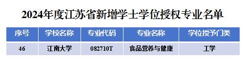 近日,江苏省学位委员会、江苏省教育厅发布了《省学位委员会 省教育厅关于公布2024年度新增学士学位授权专业名单的通知》(苏学位字函〔2024〕3号),我校食品营养与健康专业成功新增为学士学位授权专业。