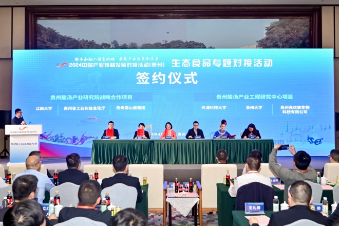 开幕式后,陈卫参加了生态食品专题对接活动,黄敏代表dafacasino网页版与贵州省工信厅、贵州南山婆集团签订共建贵州酸汤产业研究院战略合作框架协议。