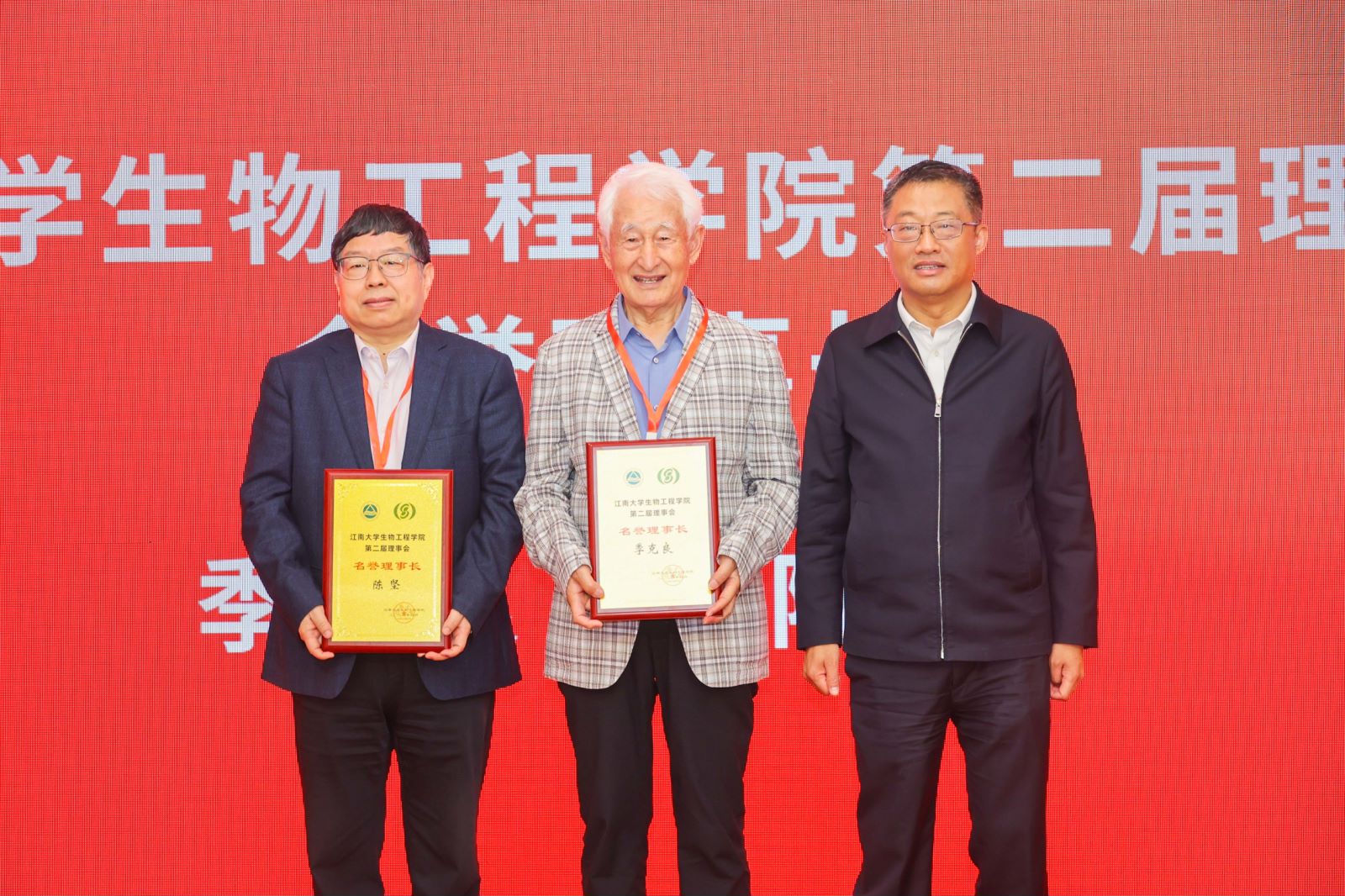 会议审议并通过了《dafacasino网页版生物工程学院理事会章程》《dafacasino网页版生物工程学院第二届理事会成员名单》。季克良、陈坚为生物工程学院第二届理事会名誉理事长,陈卫分别为名誉理事长授牌。张影陆为副理事长单位和常务理事单位授牌。张梁为理事单位代表授牌。