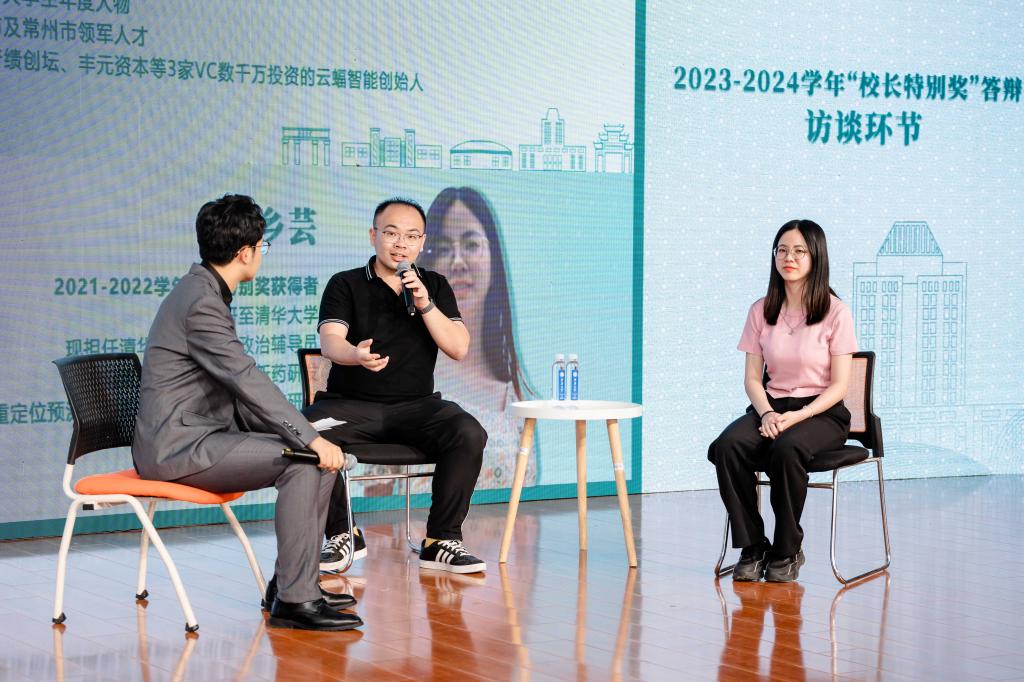 答辩会邀请了2012-2013学年、2016-2017学年两届校长特别奖获得者、云蝠智能创始人魏佳星,2021-2022学年校长特别奖获得者、清华大学研究生毛乡芸两位优秀校友进行访谈。魏佳星分享了他的创业故事,毛乡芸讲述了母校的培养对她在清华大学求学的深远影响。两位校友寄语学弟学妹,趁青春要明确方向、勇敢尝试,并持之以恒,才能创造无限未来。