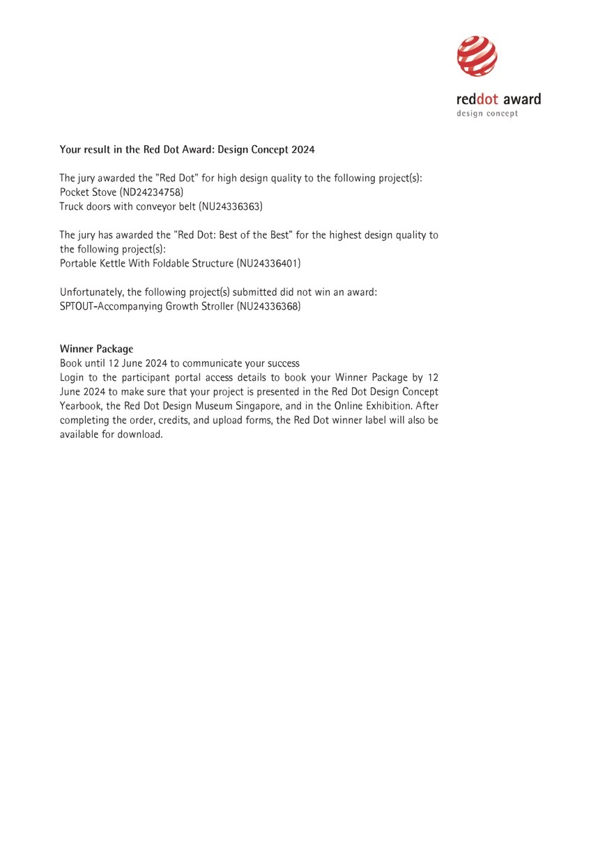 2024年,红点设计概念奖再次揭晓,设计学院产品设计系主任钱晓波老师团队(2023级硕士研究生郭建宏、潘岁、邓凯睿)的作品《折叠烧水壶Portable Kettle With Foldable Structure》荣获Best of Best至尊奖,陈香老师团队(2023级硕士研究生潘岁、邓凯睿、郭建宏)的作品《货车尾板传送门Truck doors with conveyor belt》获得winner奖,作品皆以独特的设计理念和出色的设计品质在众多专业设计公司赛道参赛作品中脱颖而出。