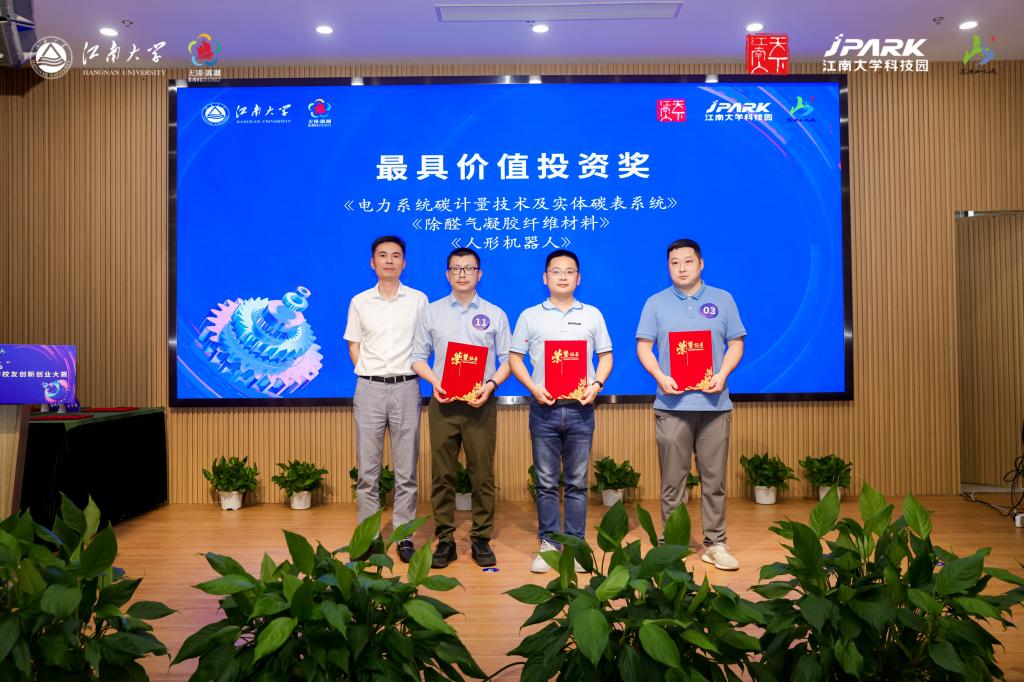 经过前期报名筛选,现场共有14个优质项目脱颖而出、同台竞技。专家评审团针对各团队的技术亮点、项目优势、市场前景等方面进行了深度点评。经过一天的激烈角逐7个项目成功晋级总决赛。“电力系统碳计量技术及实体碳表系统”获得特等奖。“基于自动驾驶算法与视觉导航技术的农业植保智能车/无人机集群创新应用项目”获得一等奖。“AI算法与透镜阵列设计联合优化的3D成显产品研发及产业化”“除醛气凝胶纤维材料”获得二等奖。“水光镜·智能制造MOM平台”“可穿戴智能纺织新材料的研发及产业化”“‘智’曲酒韵-中国首款智能化大曲发酵专家系统平台”获得三等奖。“电力系统碳计量技术及实体碳表系统”“除醛气凝胶纤维材料”“人形机器人”获得最具投资价值奖。