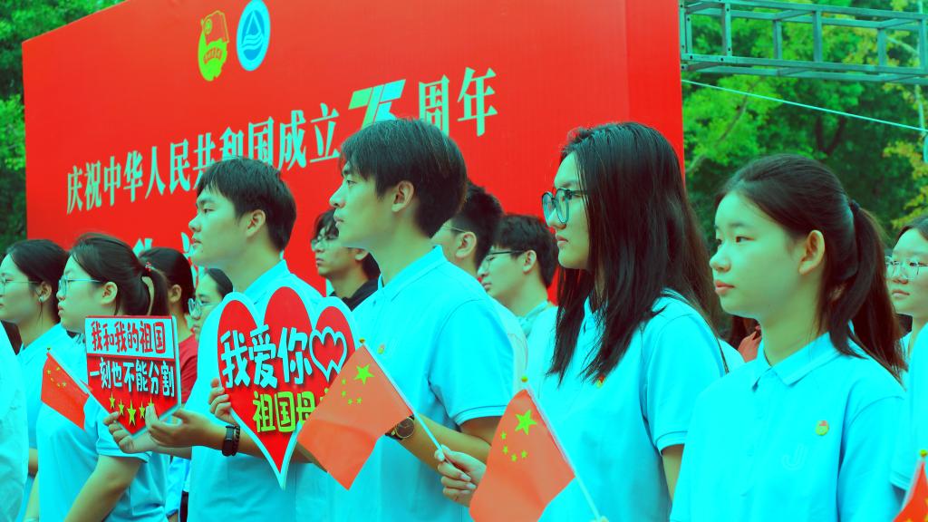 随后,校大学生艺术团吕茗敏和王郑旸同学演唱《红旗飘飘》。熟悉的旋律、深情的告白,师生们手中的国旗随着音乐旋律整齐划一地挥舞,现场成了红色的海洋。