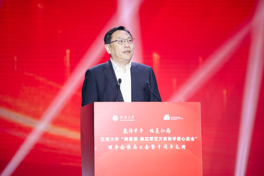 吴正国首先致辞。他代表学校党政向出席活动的领导嘉宾表示热烈欢迎,向姚惠源老师表达最诚挚的敬意。他指出,爱心基金将几代江南食品人汇聚在“培养一流食品人、追逐食品强国梦”的同心圆中,这是一种师风引领、行业协同、社会联动的育人新模式,是立德树人的良好实践。他希望学子们接续传承,常怀感恩之心,常思来之不易,担当青春使命,用所思所学增进民生福祉、推动社会进步,为强国建设和民族复兴贡献江南青春力量;希望青年教师以姚惠源等前辈为榜样,将教育家精神深植于心、付诸于行,做到立德立言立功,躬耕教坛,桃李天下。吴正国希望食品学院进一步发挥姚惠源、胡珏琴老师的精神感召力,建设好校友会、基金会、董事会等办学支撑体系,切实做好全社会协同育人的大文章,为行业、为国家、为民族源源不断地输送人才、创造价值,在健康中国、食品强国建设中作出新实践、新贡献。