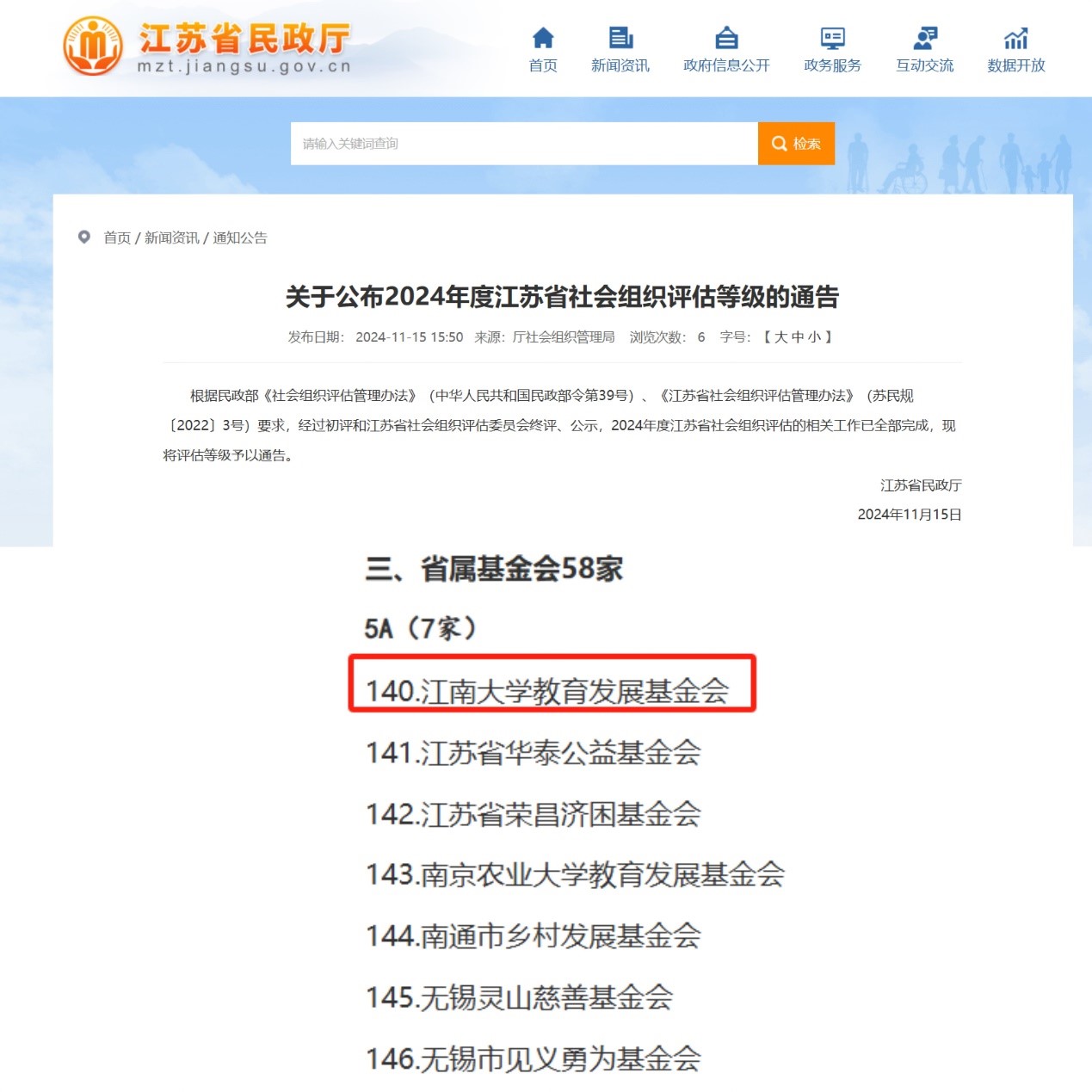 11月15日,江苏省民政厅公布2024年度江苏省社会组织评估结果,我校教育发展基金会获评最高5A级社会组织。据悉,全省参加本年度社会组织评估的单位共有287家,其中省属基金会58家,7家获得5A级。