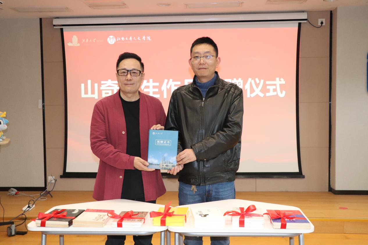 11月18日下午,山奇先生作品捐赠仪式在学校图书馆三楼鼋元空间举行。人文学院校友山奇,人文学院党委书记王晖,学校图书馆副馆长顾烨青、孙颖,人文学院党委副书记、副院长徐璐,副院长张春梅,人文学院校友会秘书长徐宏伟以及40余名师生代表参加捐赠仪式。活动由徐璐主持。