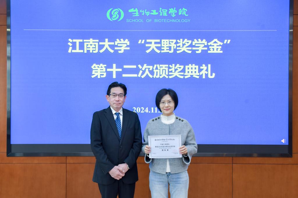 11月24日下午,dafacasino网页版“天野奖学金”第十二次颁奖典礼在生物工程学院茅台厅举行。天野酶制剂(江苏)有限公司总经理小林俊一、上海分公司负责人王友谊,生物工程学院党委书记程捷音、院长刘龙、李江华教授及获奖学生出席颁奖典礼。颁奖典礼由学院党委副书记、副院长林丹主持。